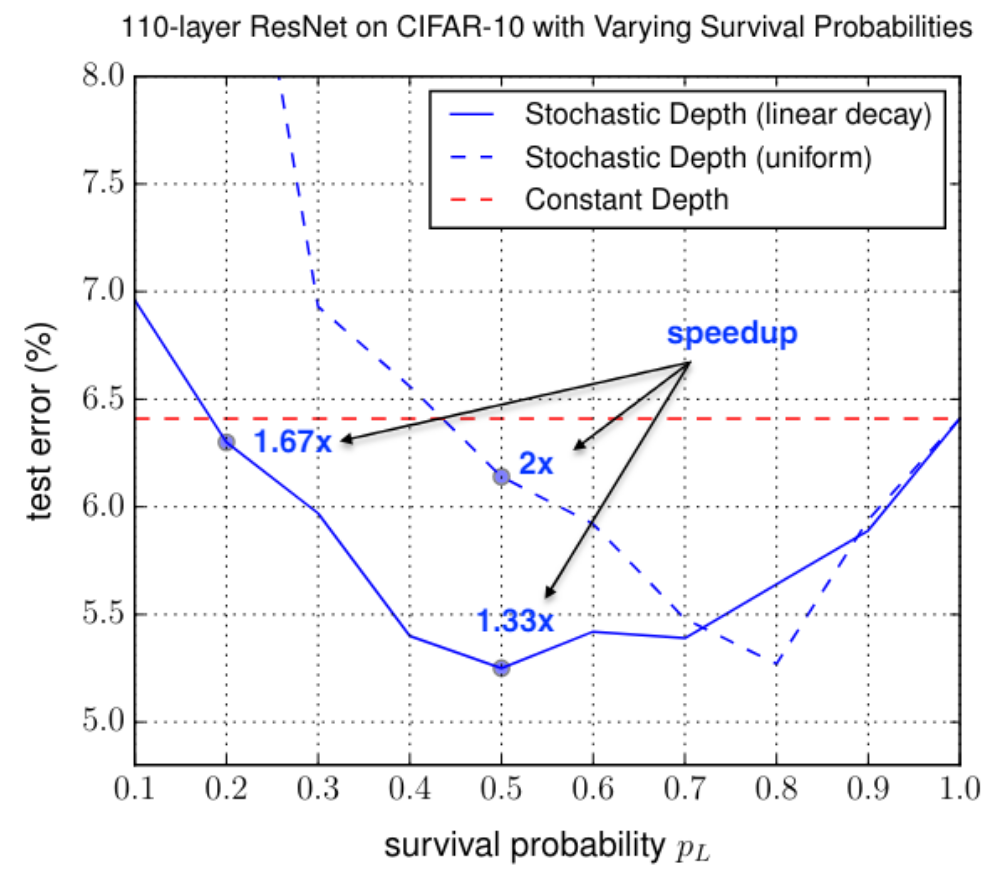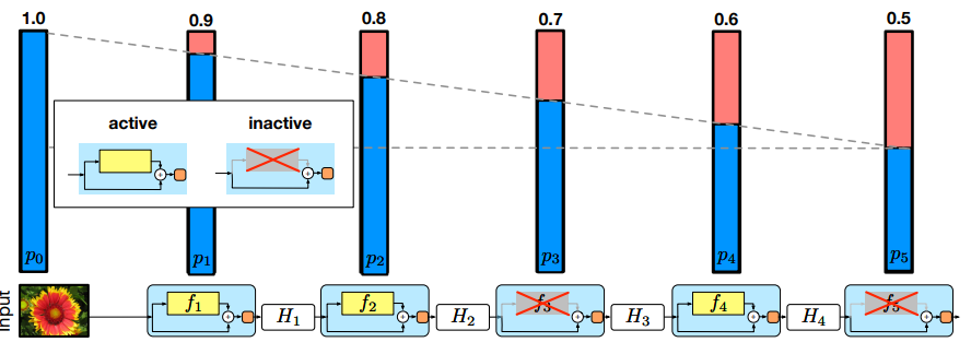 랜덤한 확률에 따라 f_l(H_{l−1})을 생략하여 output이 f(x) + x 또는 x가 될 수 있습니다.