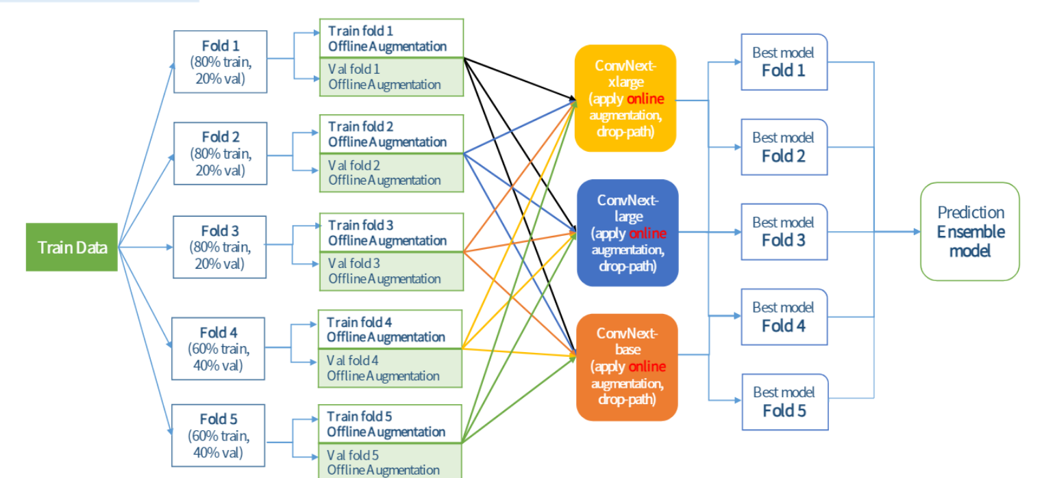 fold별로 가장 좋은 성능을 보인 weight를 갖고 ensemble 하였습니다